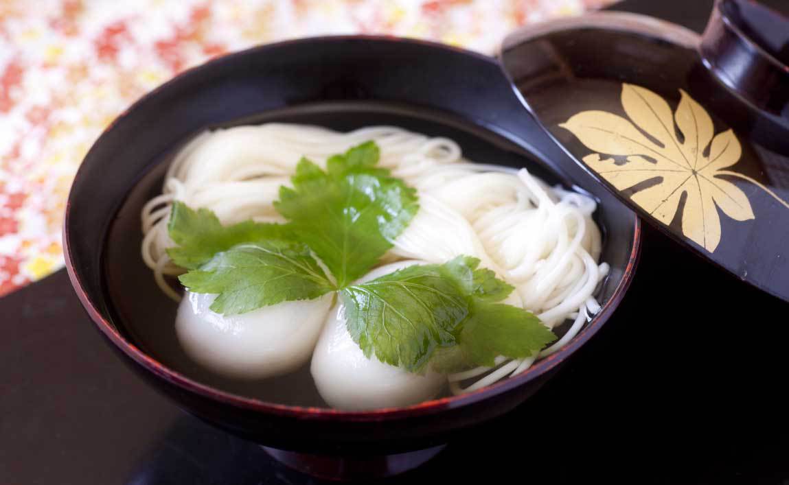 Keiran is a hot bowl dish of clear soup including egg-shaped rice dumplings with sweet bean paste filling inside. We also add walnuts in rice dumplings.